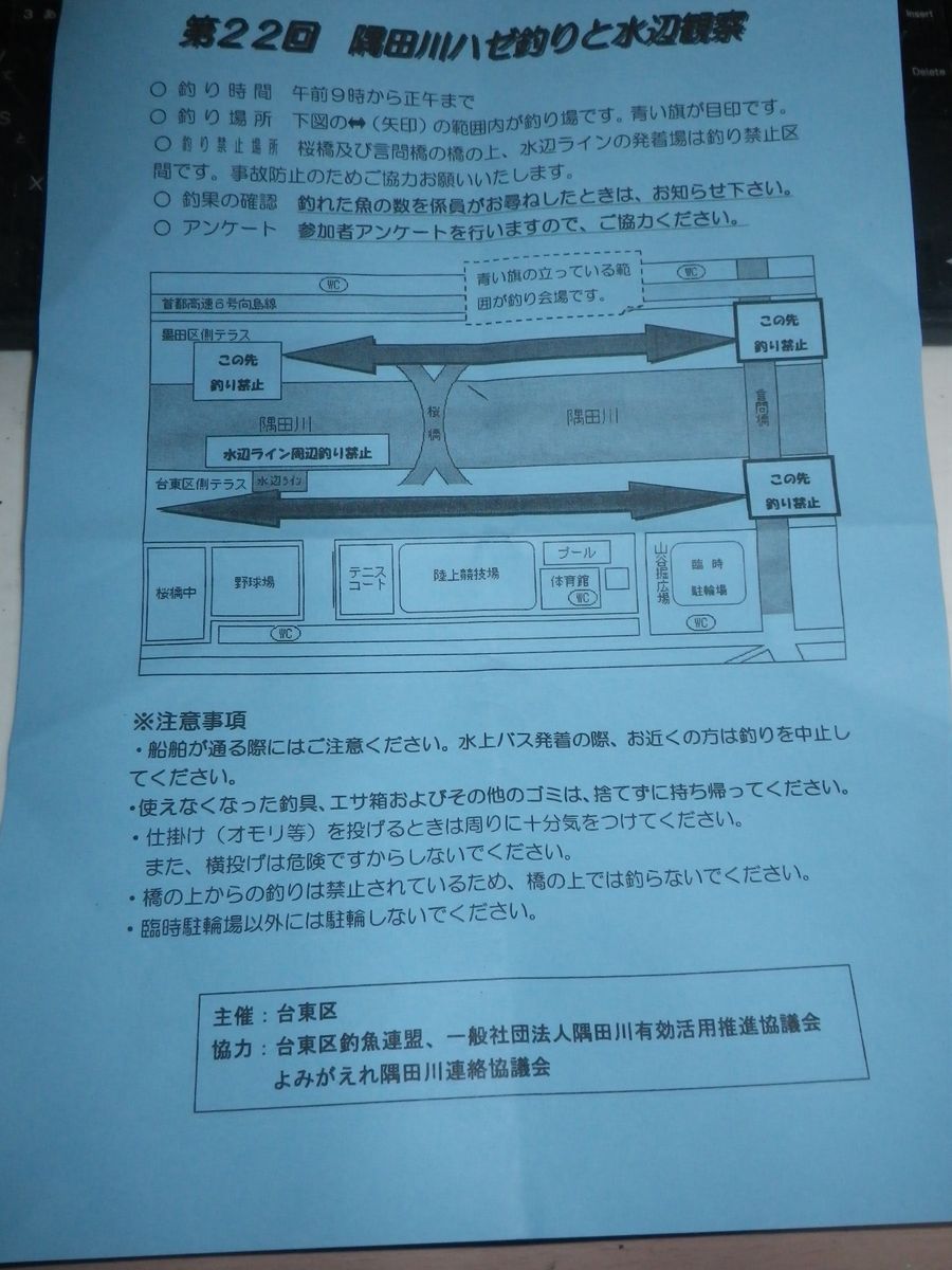 台東区が主催なので、在住、在勤、在学の方が対象なのですが検量があるわけでもなく誰でも参加?できます。事前にネット上で申し込むとハガキが送られてきて餌の青イソが1パックもらえます。(対象外の方は餌をもらえないかも)