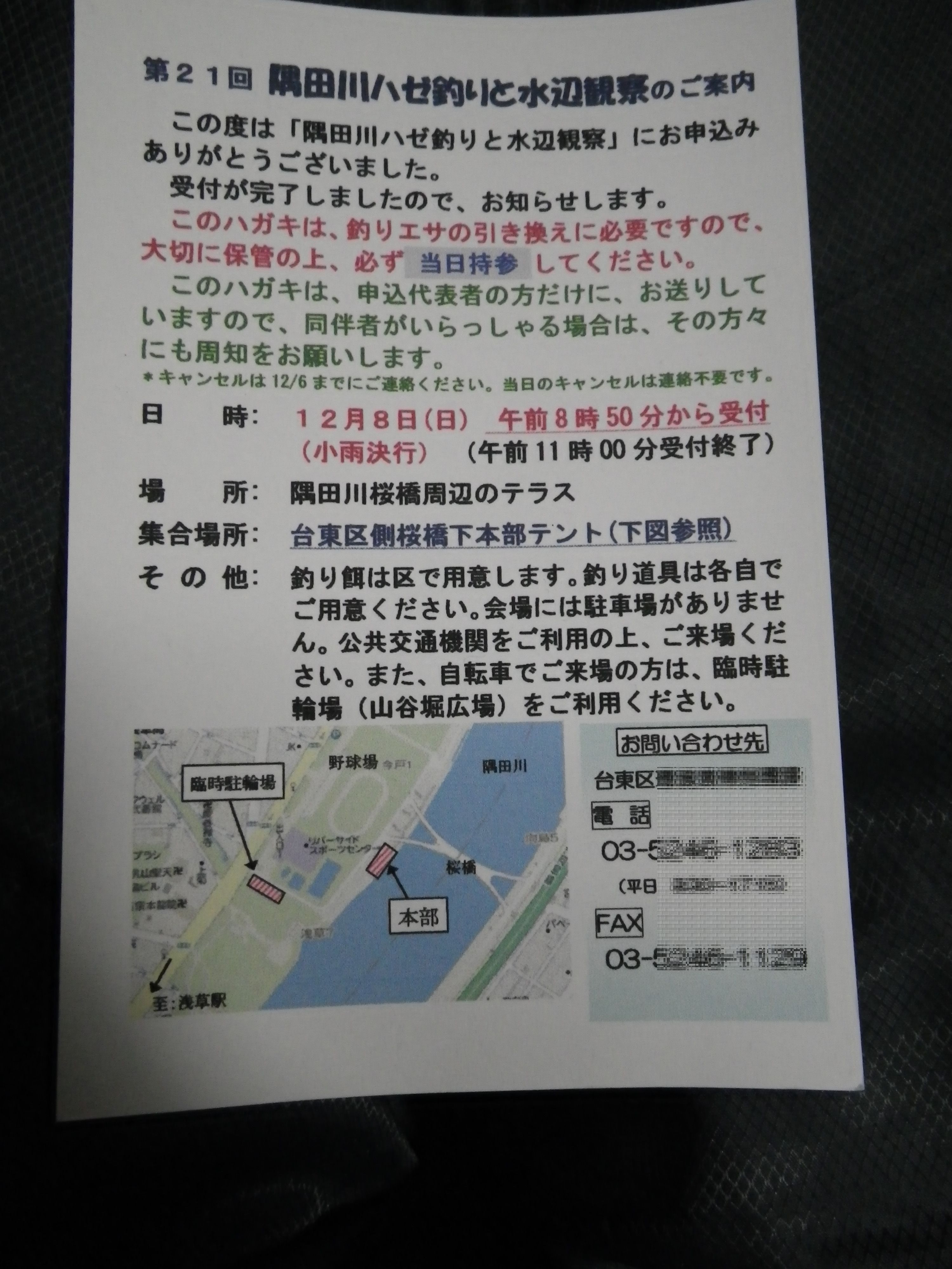 ハゼ釣りは検量があるわけではないので、当日の参加も可能ですが、餌を頂けるので事前に申し込みをし、餌と引き換えとなるハガキを持参してチャリで行ってきました。
